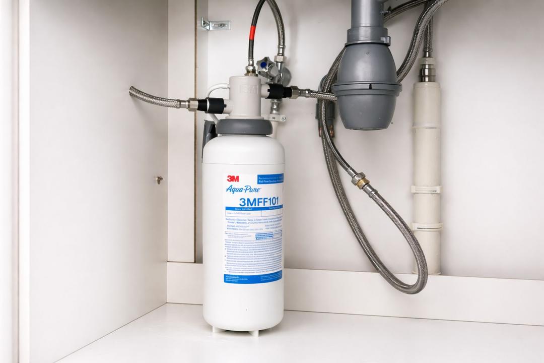 Monté sous l’évier, le purificateur 3M FF100 ne nécessite ni robinet dédié ni travaux complexes. Il s’intègre directement à l’arrivée d’eau froide et commence à purifier l’eau instantanément.